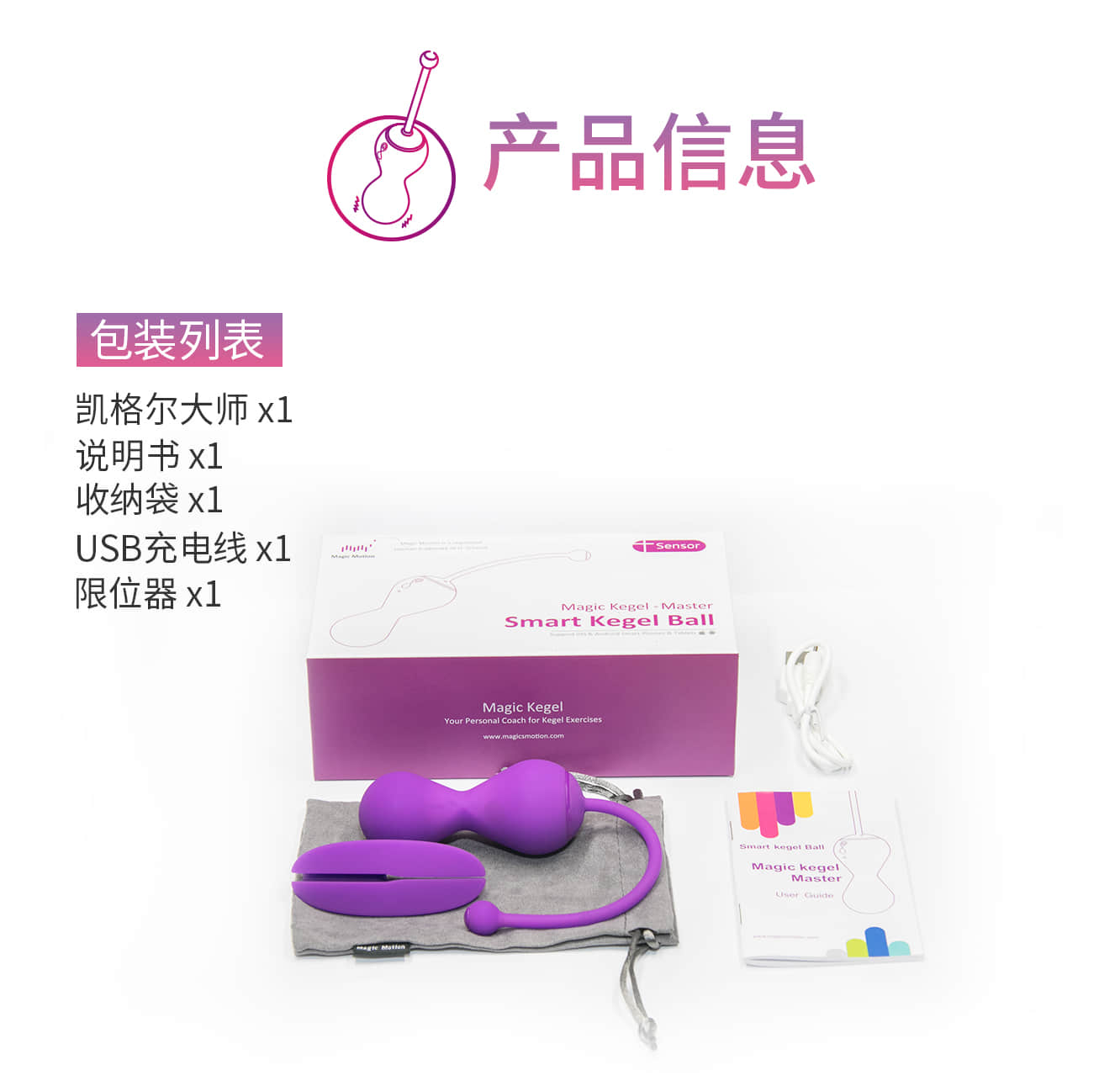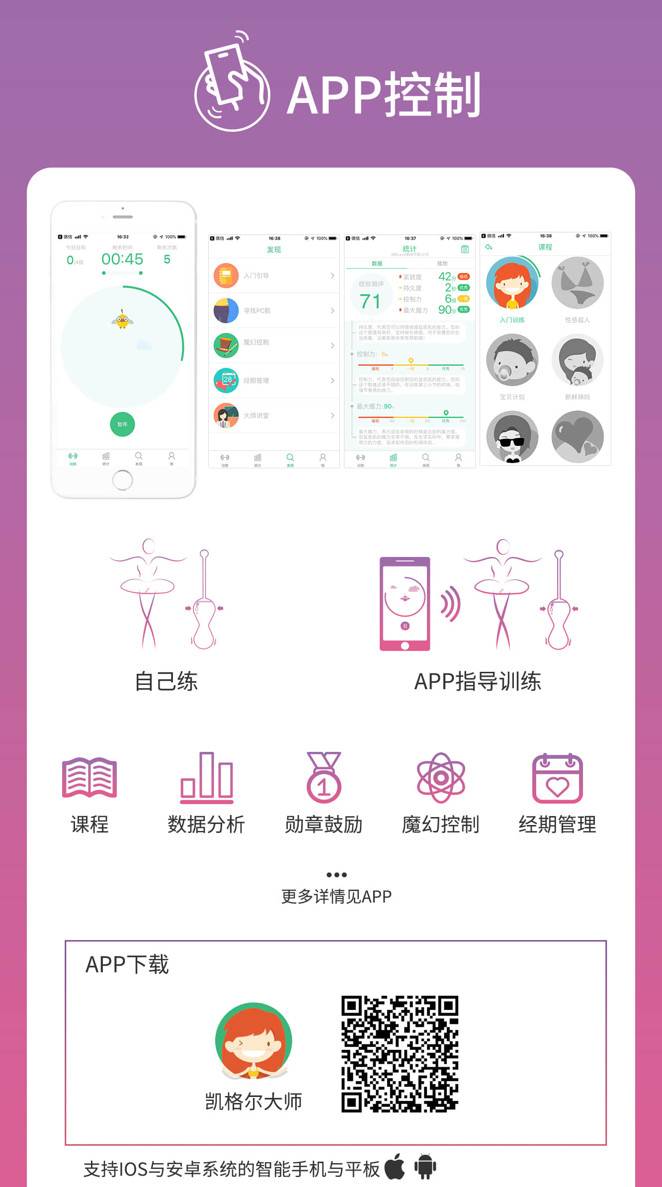凯格尔大师内置高灵敏度薄膜传感器将跟踪您的凯格尔训练进度和训练表现。语音教练将会告诉您如何进行锻炼。锻炼过程中您将通过自己的努力获得徽章、奖励。同时也可在训练结束后享受凯格尔大师带来的愉悦快感。